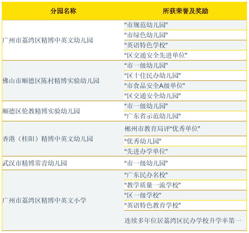 构在各地均有良好的中英文园校办学口碑,深受当地学生家长欢迎,并获得广州市荔湾区教育局、顺德 区(前顺德市)教育局、佛山市陈村镇教育局及湖南省桂阳县教育局等相关单位对我机构办学水平的高度 肯定。 多所校区获得“优秀单位”“优秀幼儿园”及“先进办学单位”“英语特色学校”“广东民办名校”“教 学质量一流学校”“区一级学校”等荣誉称号。